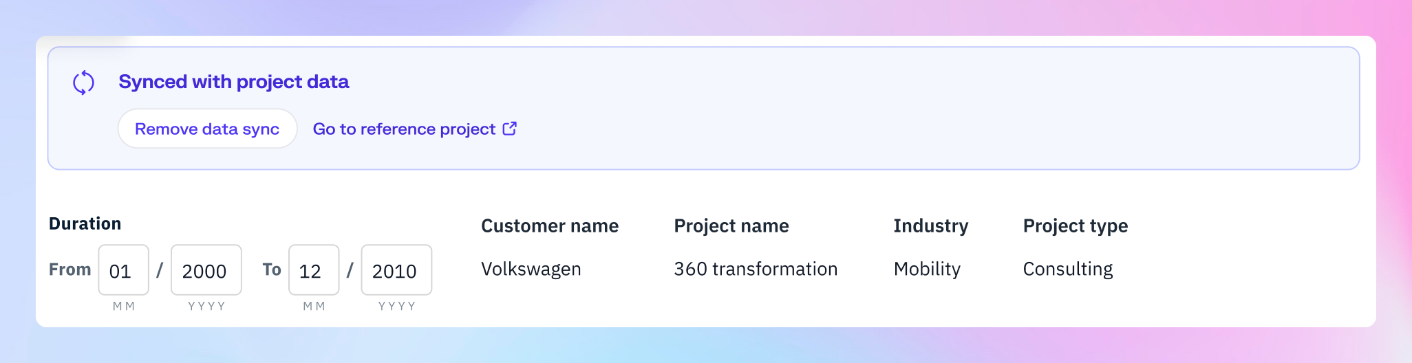 Previously, when you added a project experience to your CV, it was linked to the reference project only through matching names. If either the customer name or project name changed in the system, your CV entry would lose its connection to the source - requiring manual updates to keep everything aligned.