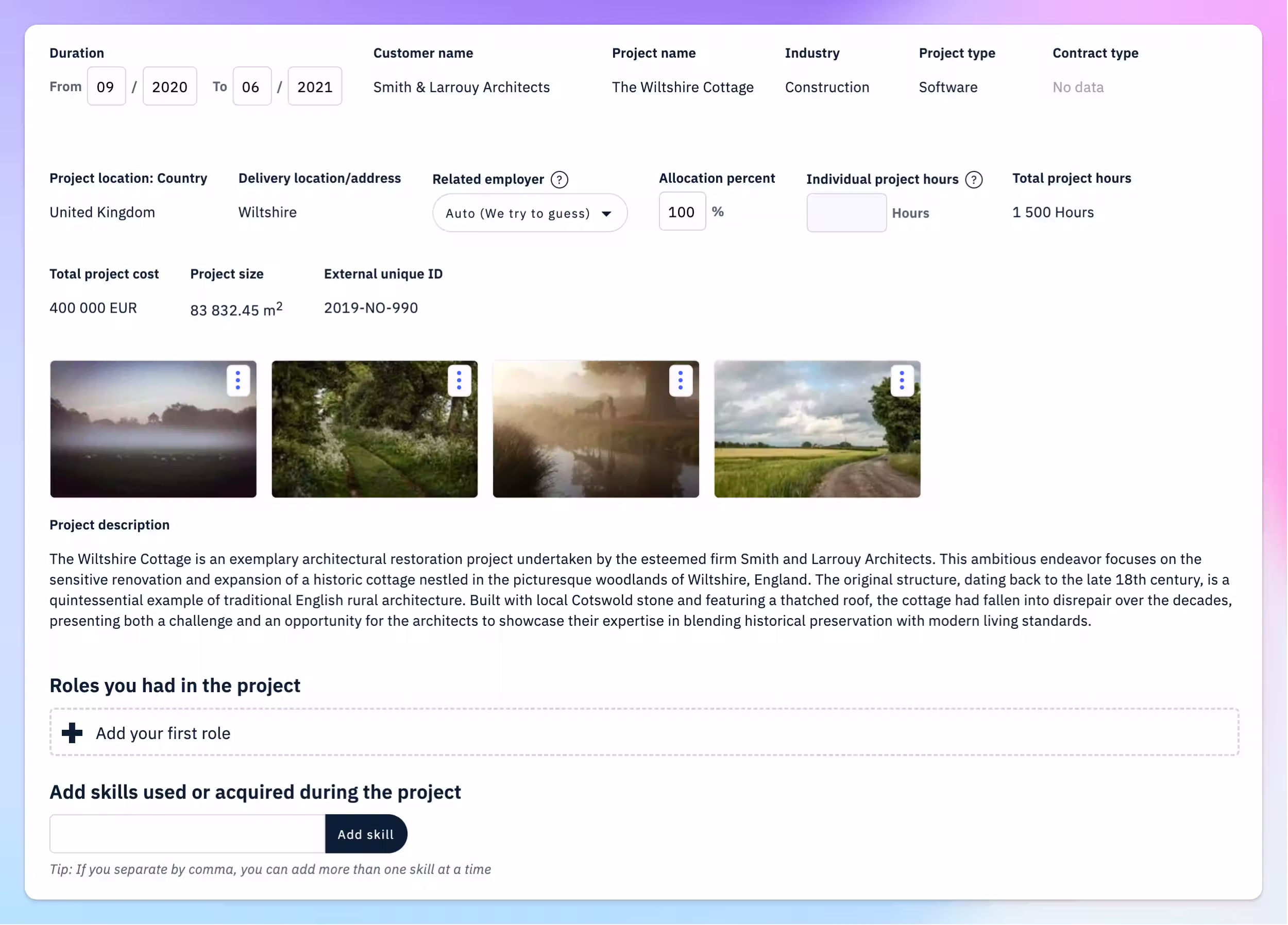 If you select an official project, the project will automatically get all the data from the official source, and it will be kept up to date with the official data - continuously, without any need for a manual push. Employees still fills in their personal contribution, like their role, role description and skills used in the project. They can even select their own date duration if that is different from the official duration of the project.